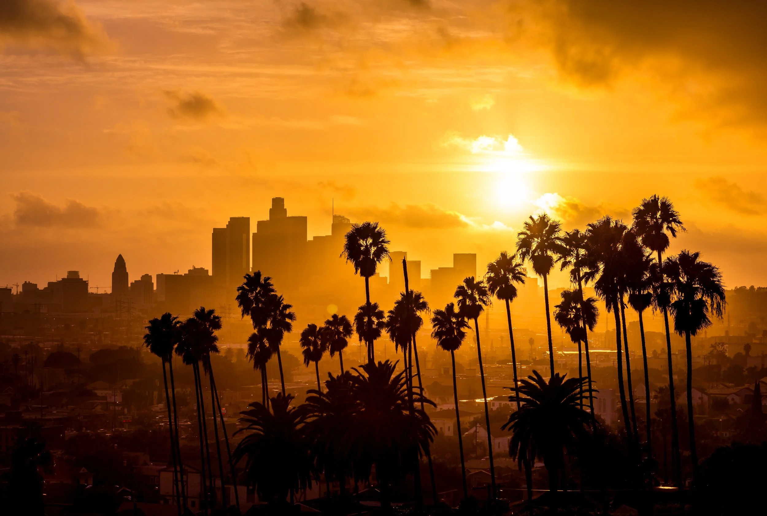 Sunset over Los Angeles with palm trees and skyline. The city’s strong analogue photography ecosystem supported by its cinema industry meant that film craft never left.